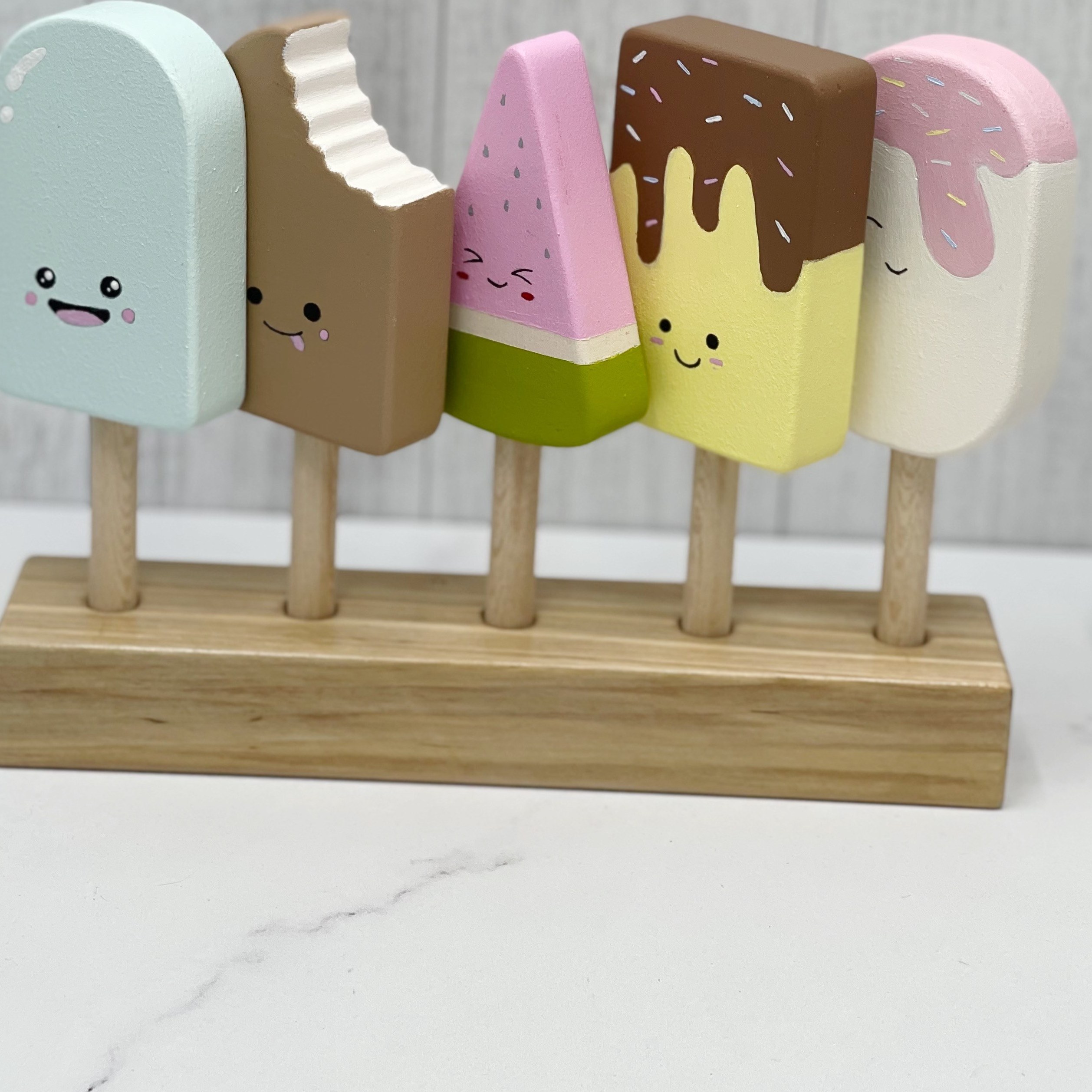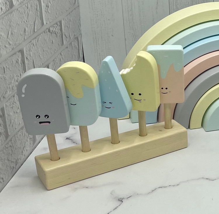 این استند بستنی چوبی جذاب شامل پنج مدل بستنی متفاوت روی یک پایه زیباست و برای طراحی و تزئین اتاق کودک، بازی تخیلی یا ستهای فانتزی طراحی شده 🎨💛